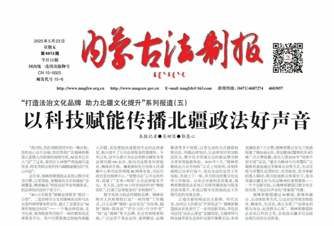 锡林郭勒盟通过AI赋能、新媒体融合、互动体验等方式,让法治宣传更加智能化、精准化、生活化,真正实现了“法律走到群众身边,走进群众心里”。锡林郭勒盟政法系统以科技之笔,在祖国北疆书写出政法现代化的生动答卷。