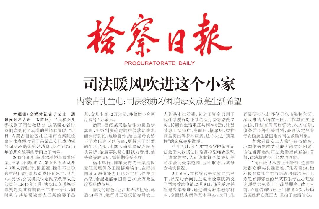 “我和女儿都收到了司法救助金,这笔暖心钱让我们感受到了满满的关怀和温暖。”近日,内蒙古自治区扎兰屯市检察院检察官朱春霞收到了吕某母女已成功领到司法救助金的好消息。这个跨越14年的悲欢故事终于画上了句号。