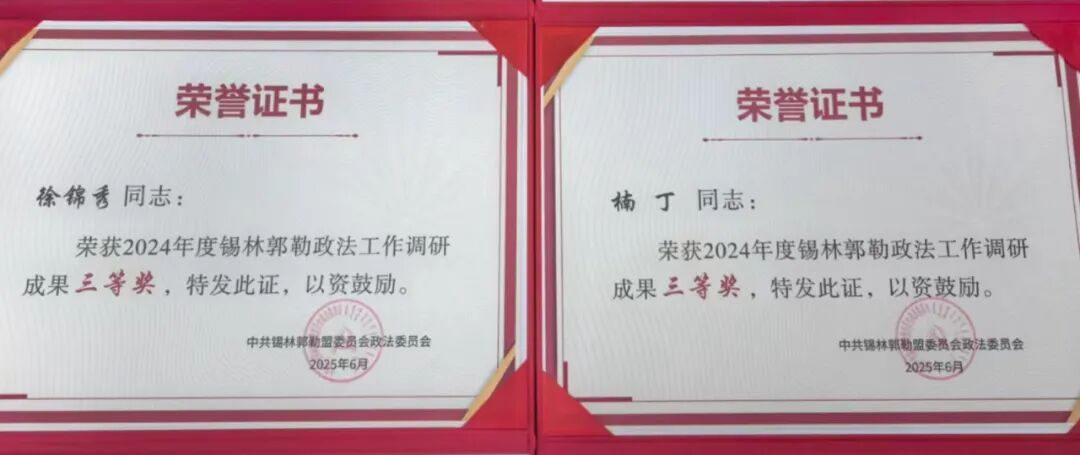 近日盟委政法委通报2024年度全盟政法调研工作优秀调研成果评选结果。正蓝旗人民检察院党组副书记、副检察长徐锦秀同志以及副检察长楠丁同志共同撰写的调研报告《关于创设马背公益守护人的思考与实践》荣获三等奖。